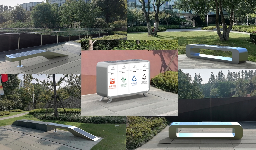 江岛智立方零碳园区零碳小品及标识系统, 光伏座椅、光伏垃圾桶、导视标识牌、精神堡垒等设施安装完成